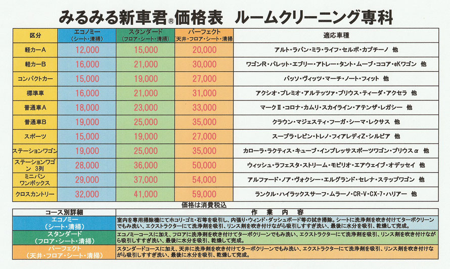 車内クリーニングに関しては無料出張、作業費用は下記の通りです。